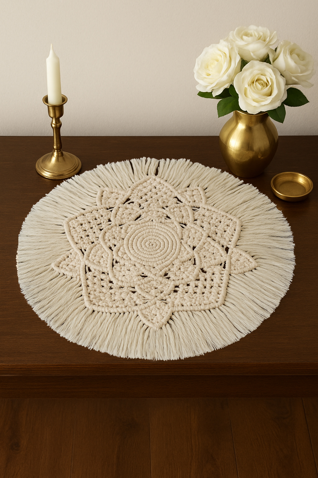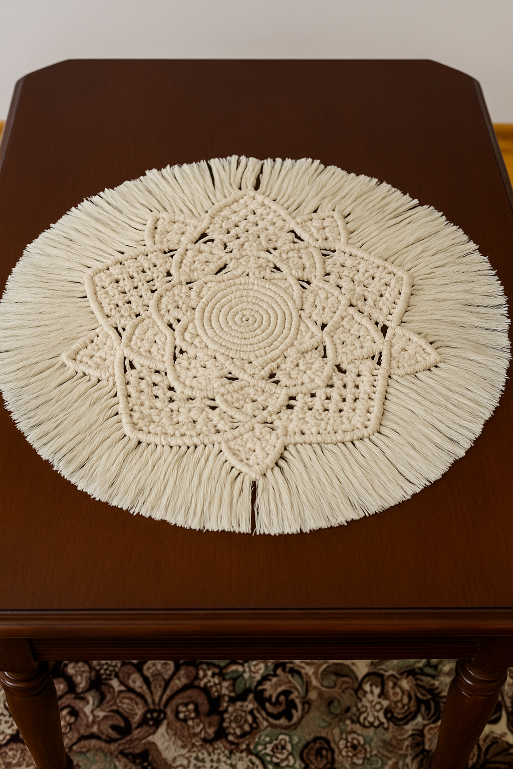 رومیزی مکرمه دستباف، ترکیبی از سادگی و هنر اصیل ایرانی این رومیزی با نخهای طبیعی و طرحی ظریف و منظم بافته شده و جلوهای خاص به دکور خانهتان میبخشد.مناسب برای میز پذیرایی، کنسول یا میز عسلی ،مناسب برای دکور آتلیه لمس لطافت هنر در دل خانه